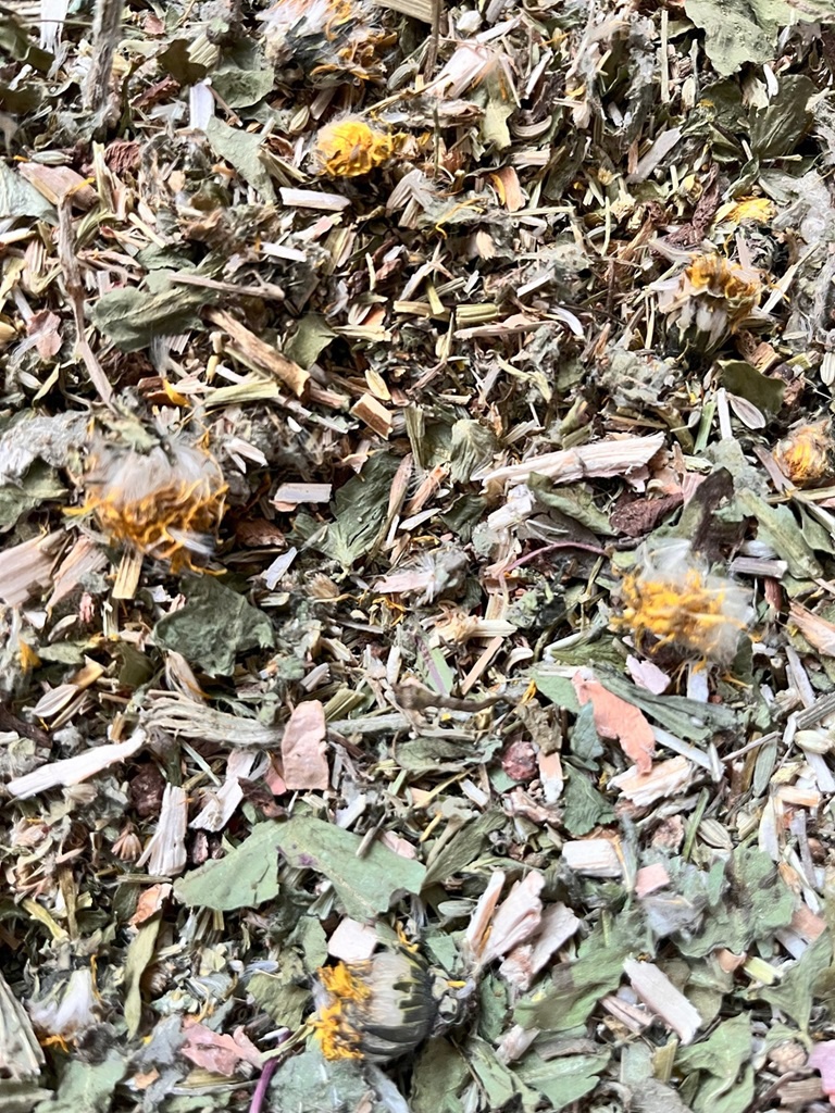 Diese Mischung beinhaltet: Löwenzahn+ Wurzel, Schafgarbe, Mariendistel Samen, Birke, Weide