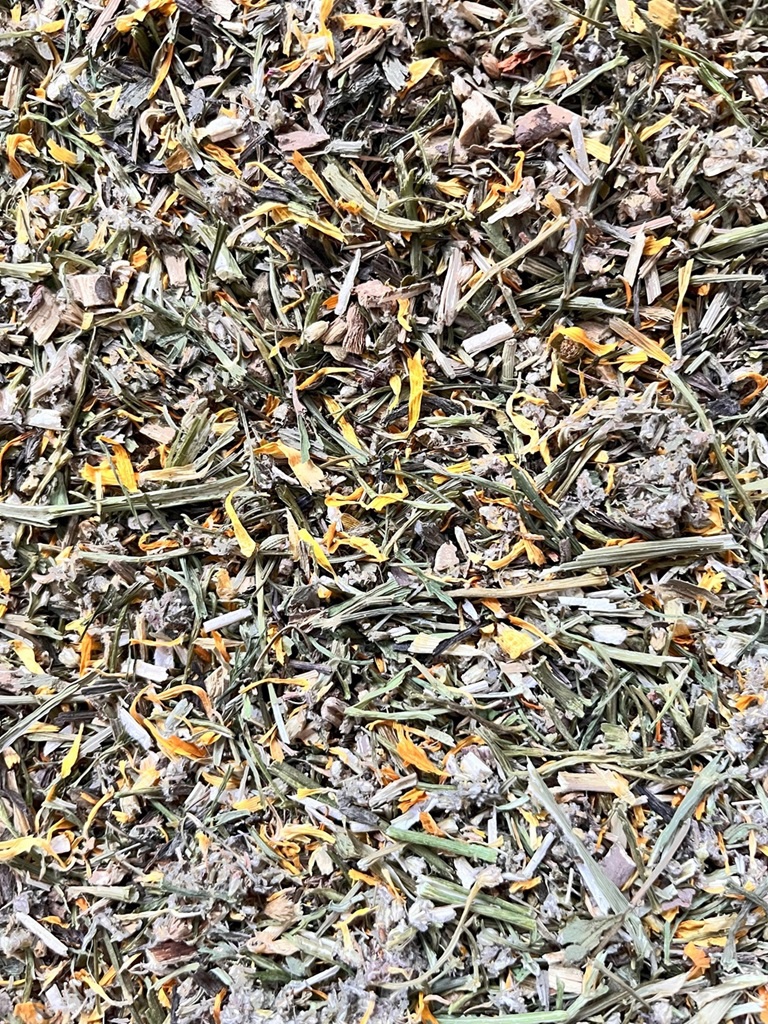 Diese Mischung beinhaltet: Spitzwegerich, Beifuß, Süßholzwurzel, Schafgarbe, Ringelblume, Kümmel, Dillspitzen